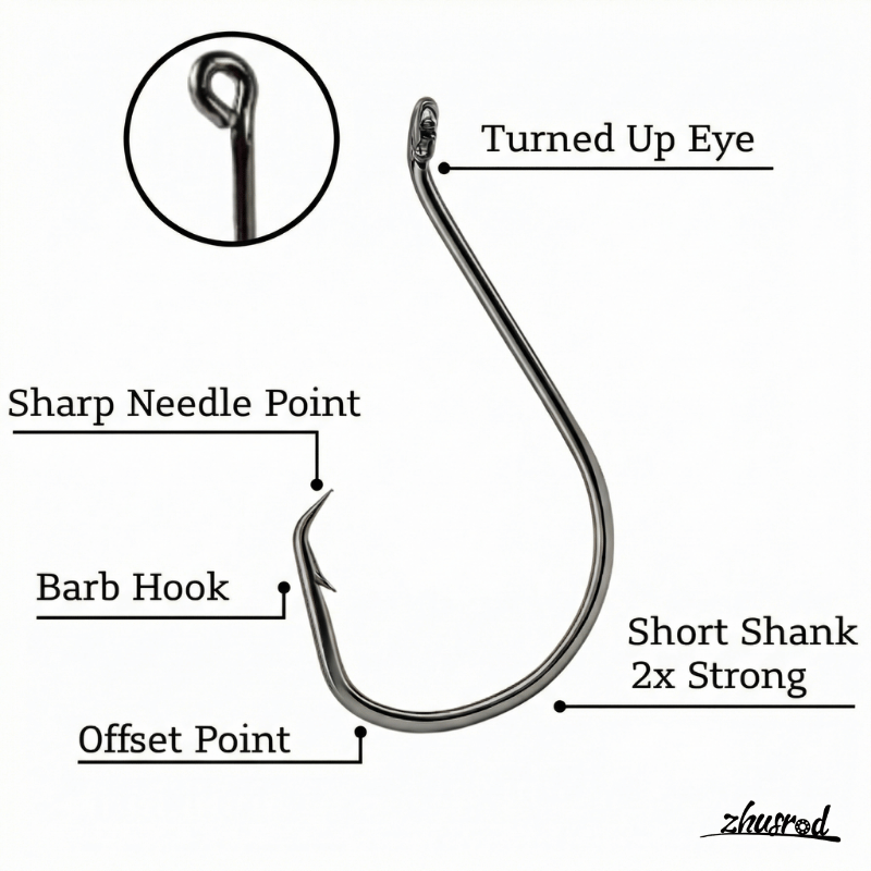 構造上の利点:スネリングを向上させる上向きのアイ、最大限のてこ作用をもたらすショートシャンク 2x 強力ワイヤー、およびフックアップ率を高めるオフセット ポイントを備えています。